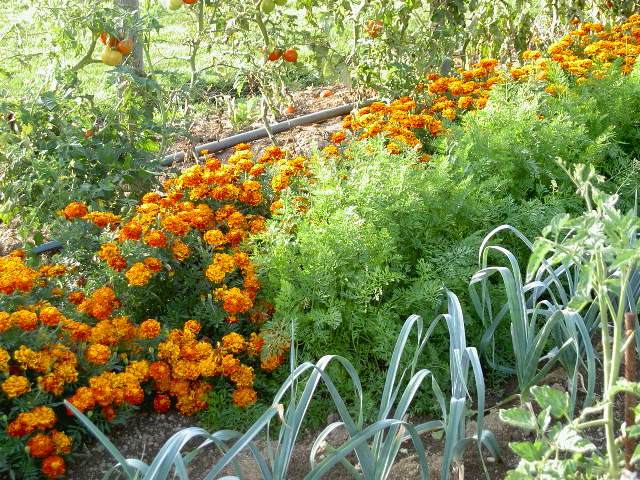 Plantez en bordure des carrés de légumes des plantes insecticides comme basilic, valériane, hysope, mélisse, aster, capucine, cosmos, chrysanthème, œillet d’Inde, souci, chanvre, menthe, romarin, sauge, tanaisie, lavande et thym. Par opposition, plantez certaines plantes qui attirent les nuisibles (capucines pour les pucerons noirs par exemple), il suffira ensuite de les arracher et les brûler. (cf “Push-Pull”)